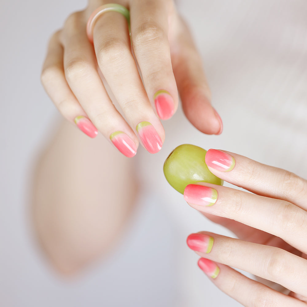 Refresh your fingertips with this cool fruit sorbet-inspired manicure. Features a juicy watermelon pink syrup gel base and bright lime-colored cuticle accent lines. A little pink ombre nails with a pop of color can be so eye catching!