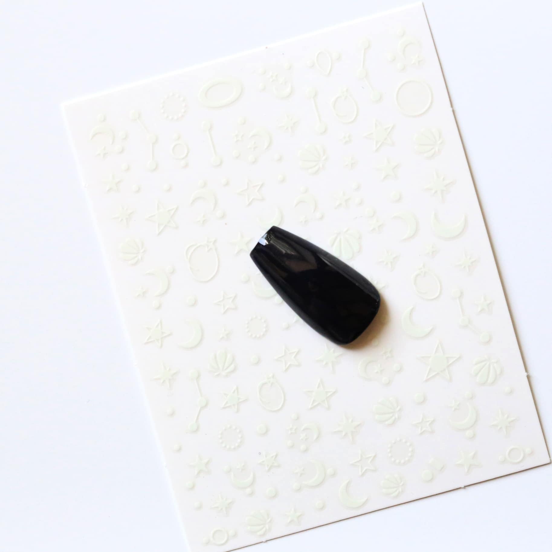 Note: Nail piece used in image is the largest acrylic size in a press-on nail set. This gives reference to the size of the stickers and how it will look when applied to nail.